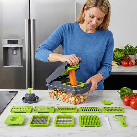 12-in-1 Multifunktionaler Gemüseschneider mit Wechselklingen und Auffangbehälter