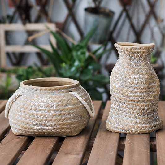 Keramik Pflanzentopf im Hanfbeutel-Design mit Seilgriffen – Dekorativer Blumentopf für Garten und Zuhause