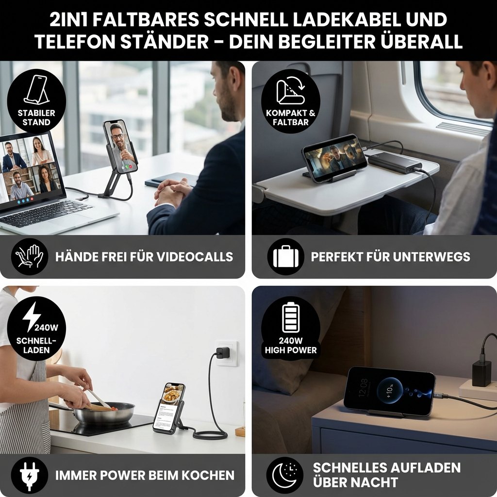 Das 2in1 faltbare Schnellladekabel mit Telefonständer ist die clevere Lösung für alle, die unterwegs und zu Hause Wert auf Komfort, Ordnung und Effizienz legen. Durch sein kompaktes Design kombiniert es zuverlässiges Schnellladen mit einem stabilen Smartphone-Ständer und macht deinen Alltag spürbar einfacher.