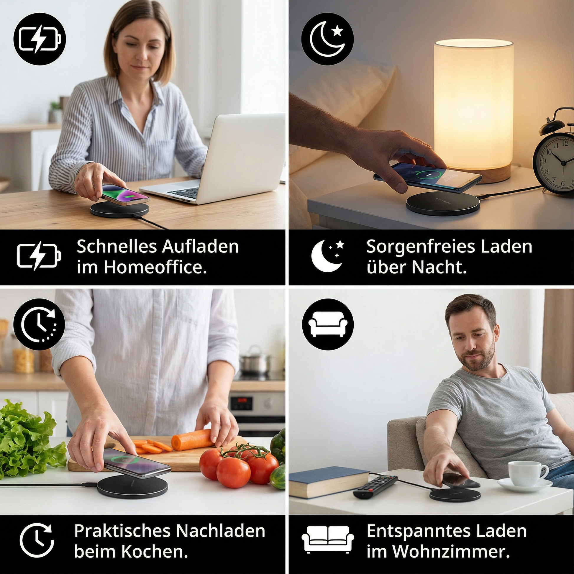 "Das 30W Kabellose Schnellladegerät ist unglaublich praktisch! Es lädt mein iPhone in Rekordzeit auf, ganz ohne Kabel, was es perfekt für den Einsatz im Büro oder zu Hause macht."