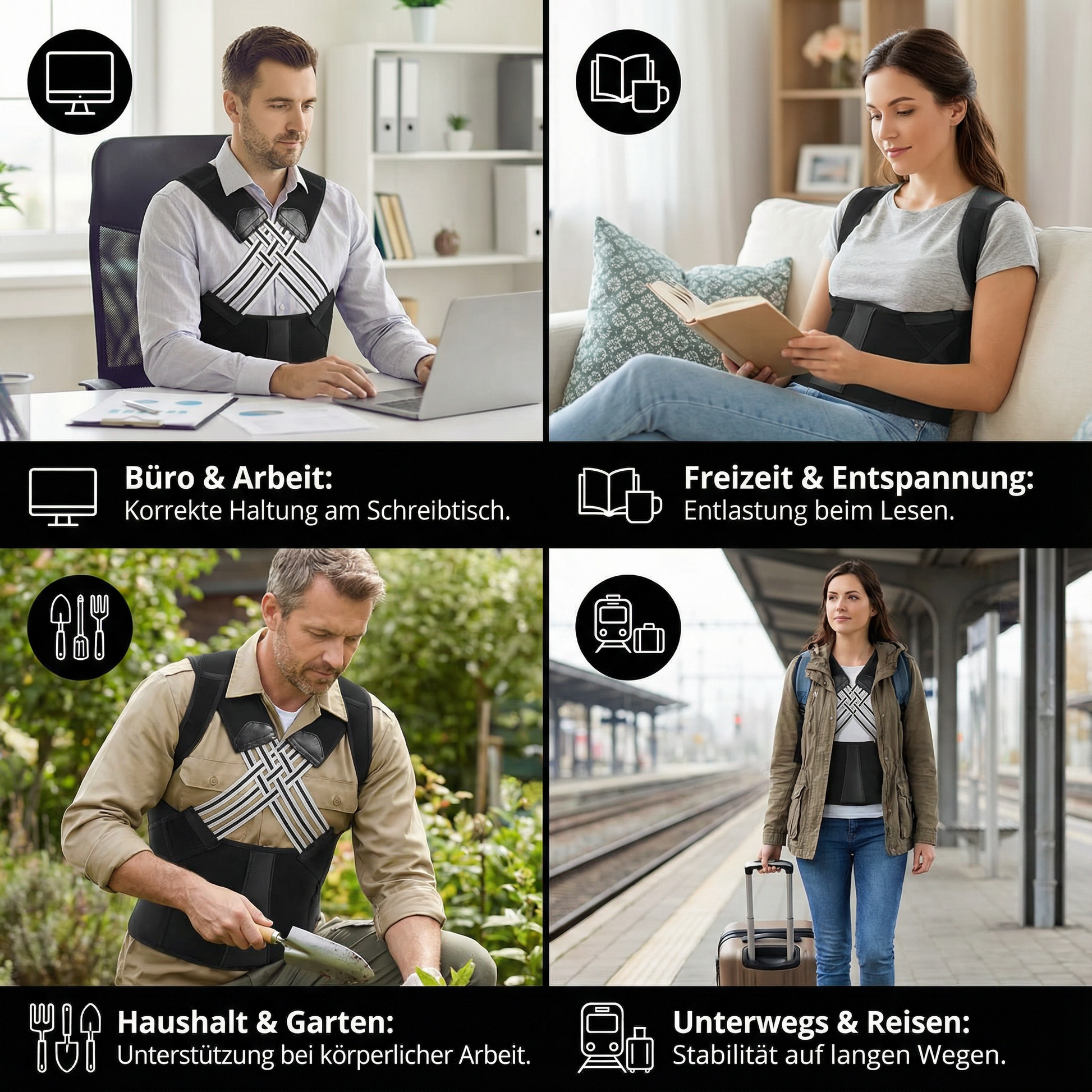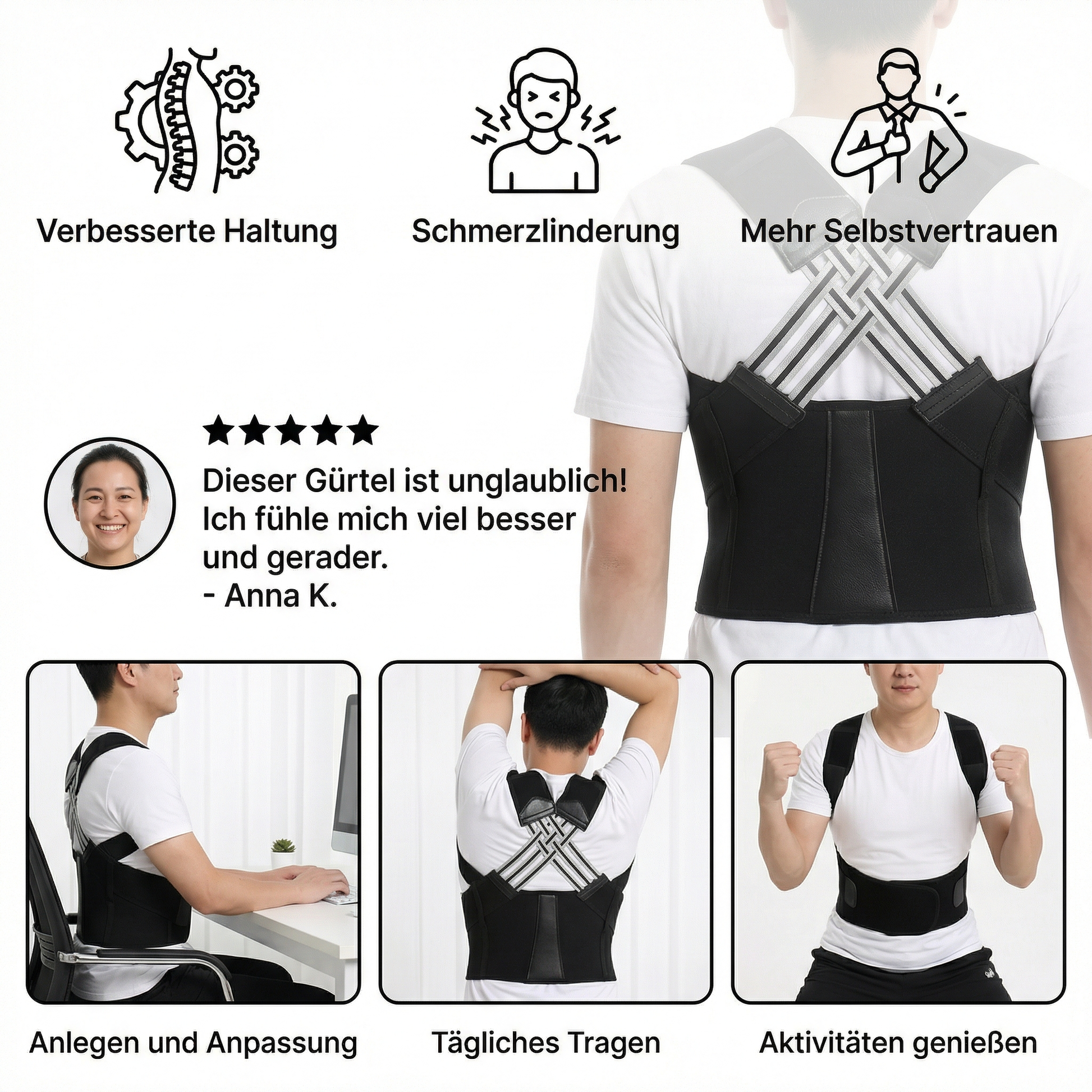 "Der Rücken Korrektur Gürtel ist wirklich ein Lebenserleichterung! Er sorgt für eine sofortige Verbesserung der Haltung und fühlt sich dabei auch noch bequem an."