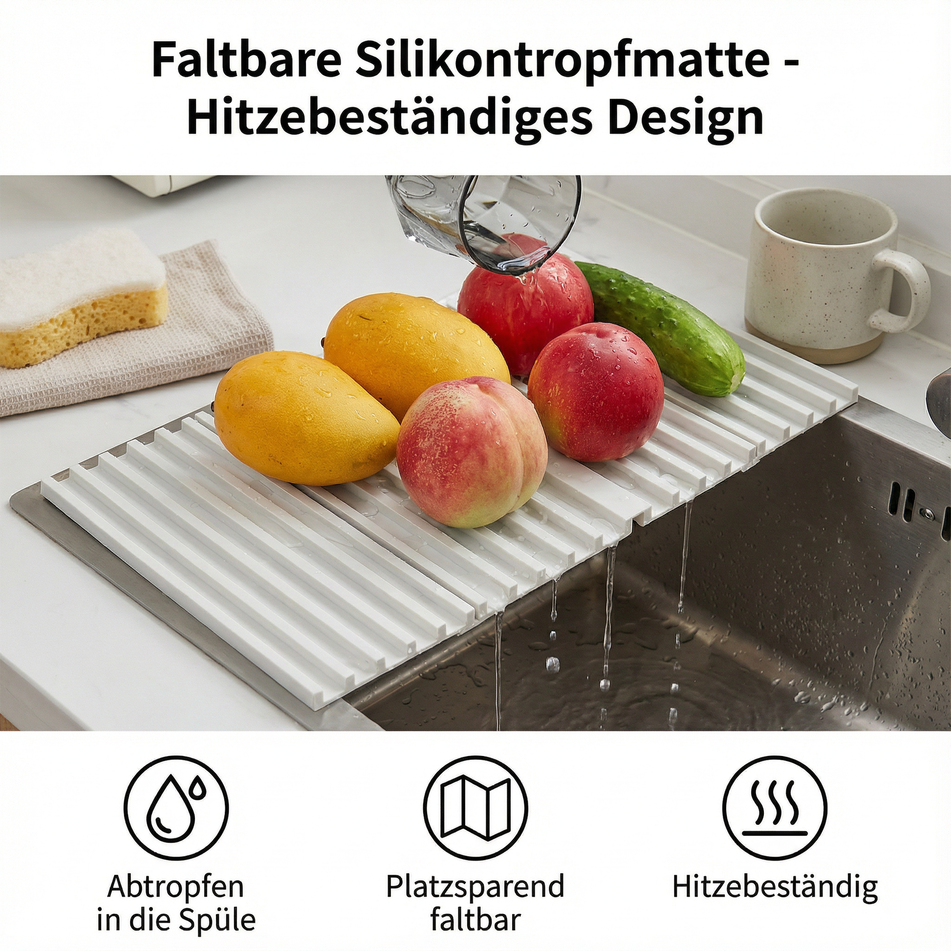 Mit der Faltbaren Silikontropfmatte können Sie heiße Gegenstände sicher abstellen, ohne sich Sorgen um beschädigte Oberflächen zu machen. Sie schützt sowohl Ihre Küchenarbeitsplatte als auch den Tisch oder Grill vor Hitze.