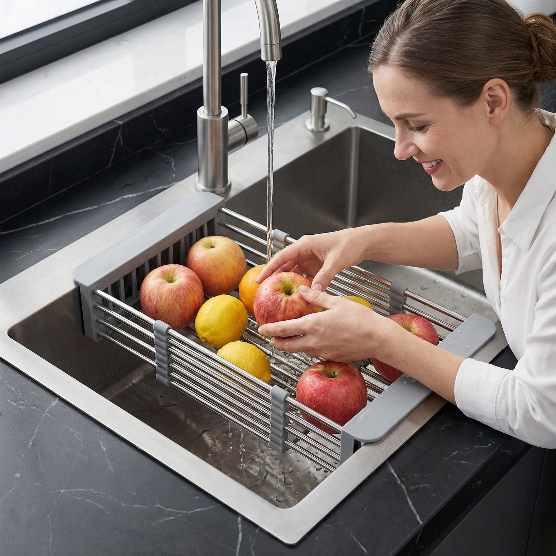 "Das Abtropfgestell ist sehr stabil und lässt sich problemlos an die Spülengröße anpassen, was es unglaublich praktisch für verschiedene Küchen macht. Besonders gefällt mir, dass das Wasser direkt ins Spülbecken abläuft, sodass keine Pfützen auf der Arbeitsplatte entstehen!"